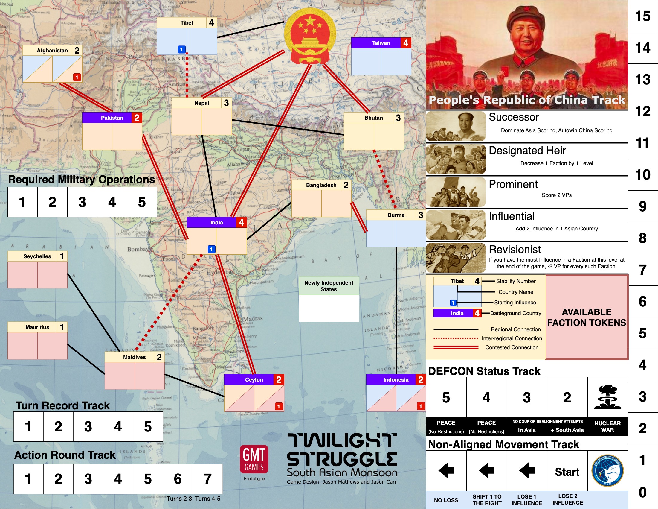 -¿Por qué el sur de Asia?Tanto con Twilight Struggle: Red Sea como ahora con TS: South Asian Monsoon, realmente estamos abordando las omisiones de la historia real de la Guerra Fría. Ananda y yo desarrollamos un lindo truco de "la Carta de China" para el Twilight Struggle original. Tiene cierta legitimidad simulada en términos de retratar a China como una potencia "oscilante" en la Guerra Fría. La Carta de China es esencialmente un juego de palabras de política exterior, pero no es la historia real de la participación de China en la Guerra Fría, que fue dramática, significativa y tuvo un enorme impacto en la estrategia estadounidense y soviética. En el juego base, dado que China se abstrae, Twilight Struggle no puede reflejar con precisión la danza de 50 años entre India, China y Pakistán y su búsqueda de la primacía regional. Sin embargo, esta es una dinámica muy importante que define gran parte de lo que sucede en los momentos cruciales de la Guerra Fría.